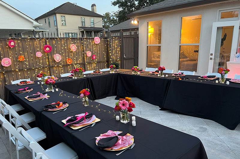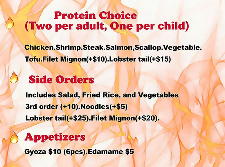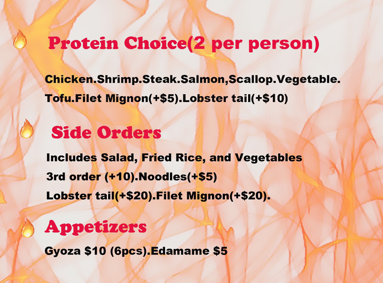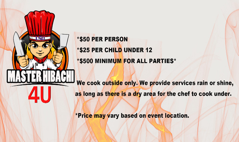 We bring our own hibachi grill and experienced chef. Each guest can choose their own customized meal. It starts with a side salad and comes with hibachi vegetables, fried rice, and 2 choices of protein.